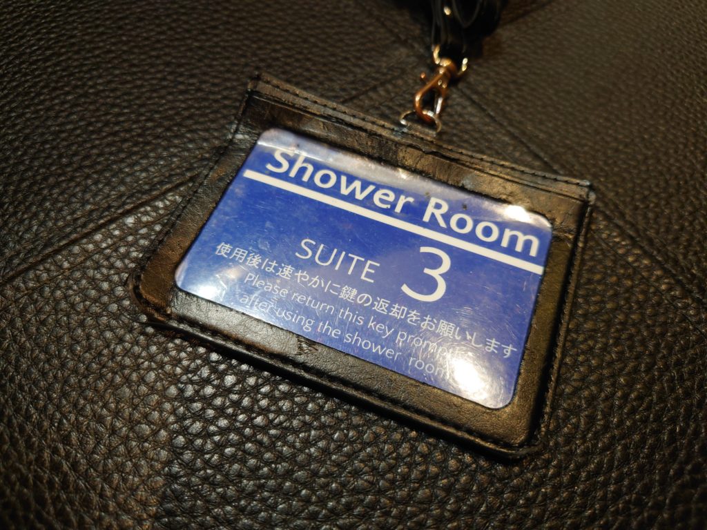 席にカバンを置いたにも関わらずすぐに持ち直してシャワールームの空きを聞きに行きます。