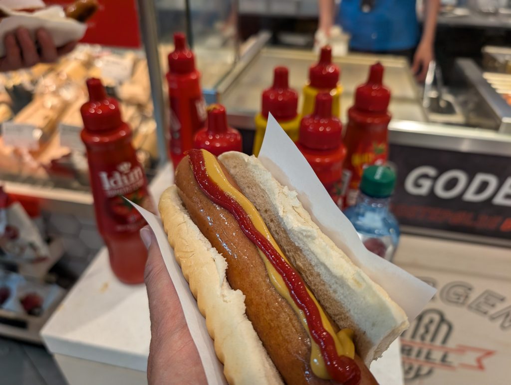 乗り換えの時間になぜかお腹がすいてしまったので制限エリア内のコンビニでホットドックを購入しますが、こんなIKEAのホットドックを少し大きくしただけのやつ(失礼!)が1,500円です。