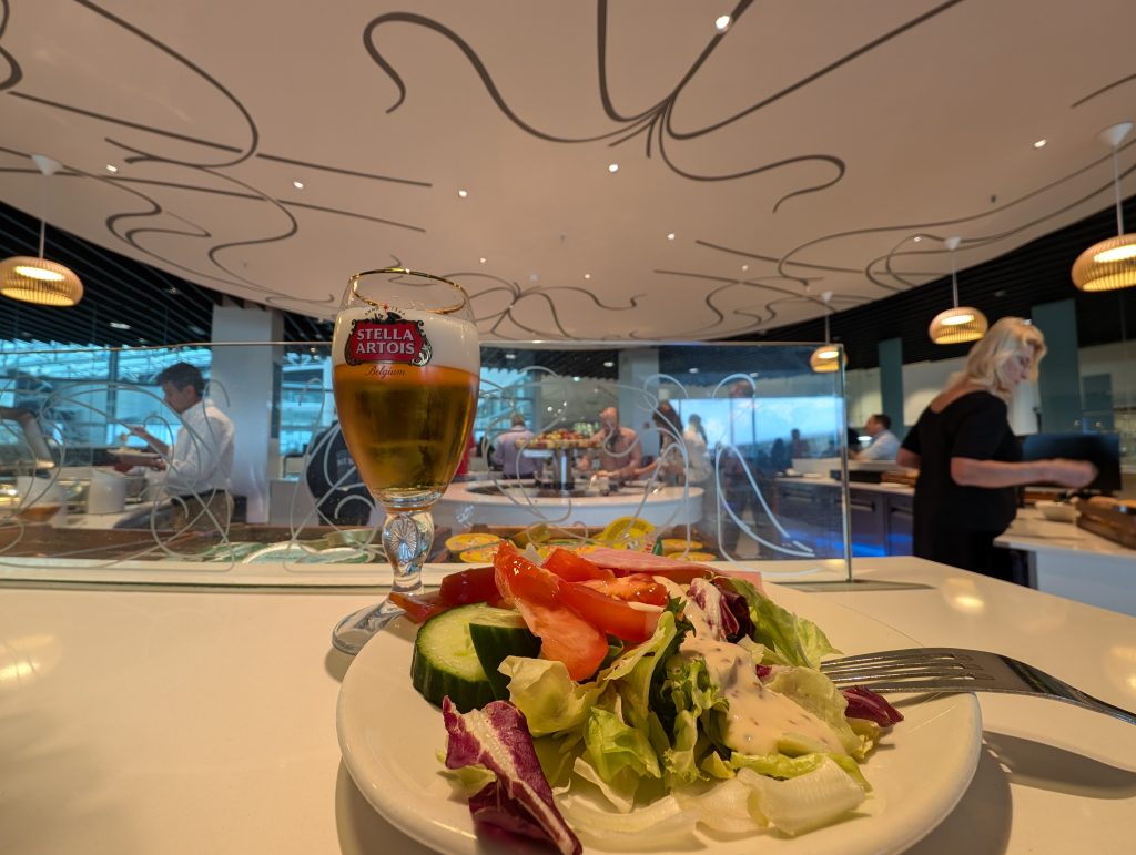 このあとフランクフルトからのANA便はダイヤモンド会員のアップグレードビジネスクラスでのディナーが待っているので、食事はサラダだけにしておきます。