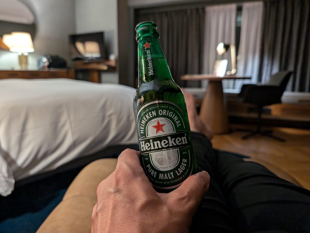 すでに23時30分なので寝ようと思ったのですが、1週間ぶりにバスタブがあったのでいったんエントランスまで戻ってホテル内のコンビニでビールを1本買います。