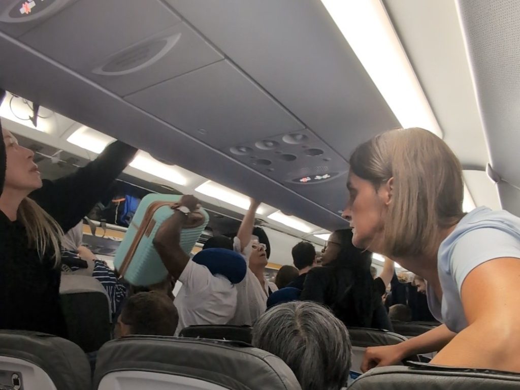 22時前に滑走路へと着陸した飛行機ですが、着陸した瞬間から乗客が荷物を出してドアに向かって集まります。