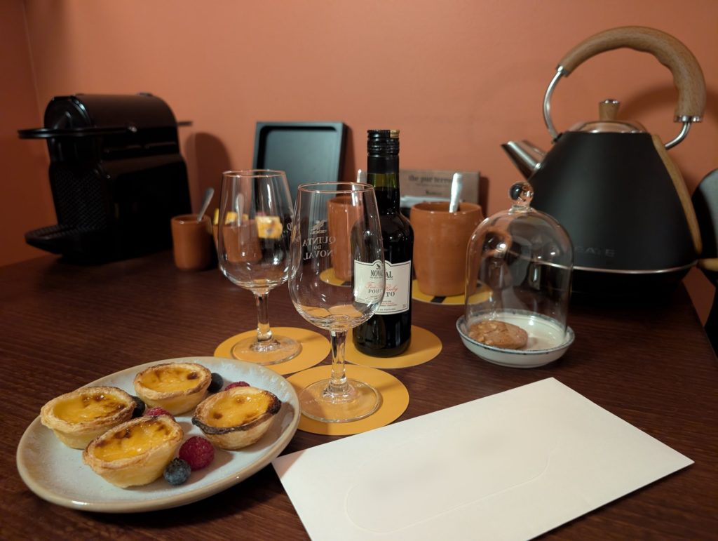 冷蔵庫のドリンクがサービスというのは見かけますがそれだけでなく、寝室のテーブルにはポルトガル産の赤ワインと同じくポルトガル銘菓のナタ(エッグタルト)が所狭しとセッティングしてあります。