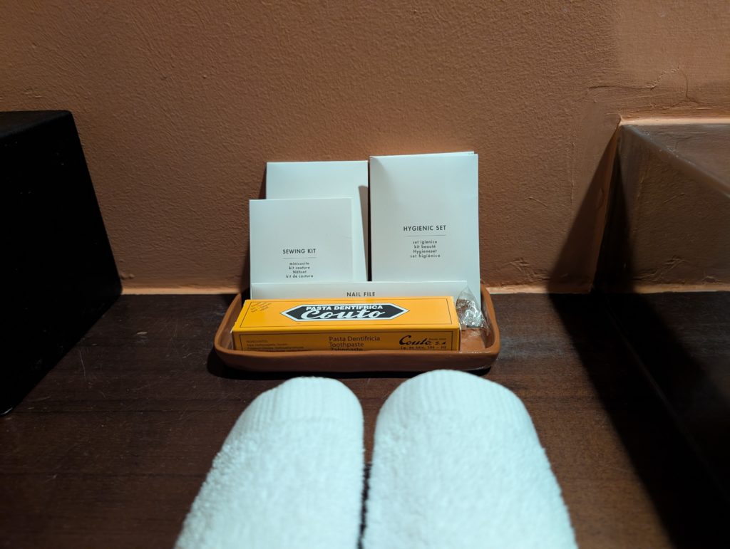 洗面にはヨーロッパとしては珍しくアメニティが置かれています。アメニティの内容は本気サイズの歯磨き粉、ソーイングキット、爪やすりとコットン綿棒、シャワーキャップです。